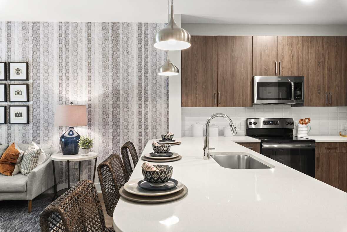 Browse our photo gallery to view our luxury apartments in Chamblee. Community amenities like our flexible work spaces with Wi-Fi, fitness center with Peloton® bikes, dry cleaning and laundry service, and so much more, make your everyday life a breeze. Then, step into your one or two-bedroom apartment home and relax with features like fiber internet, smart thermostats, built-in bookshelves, and more.